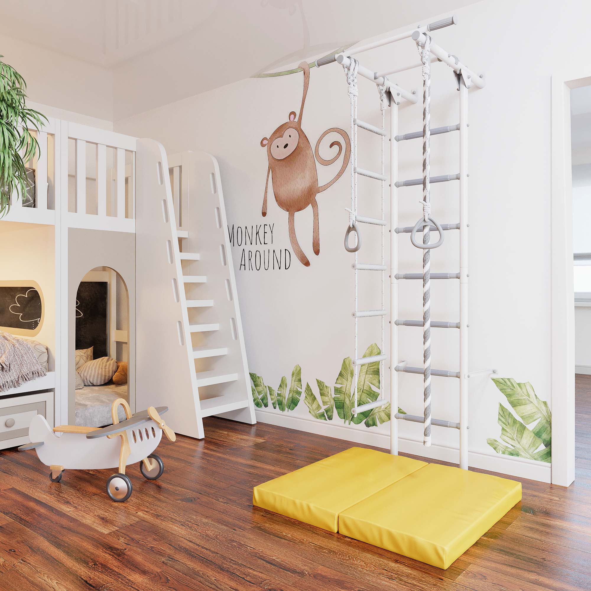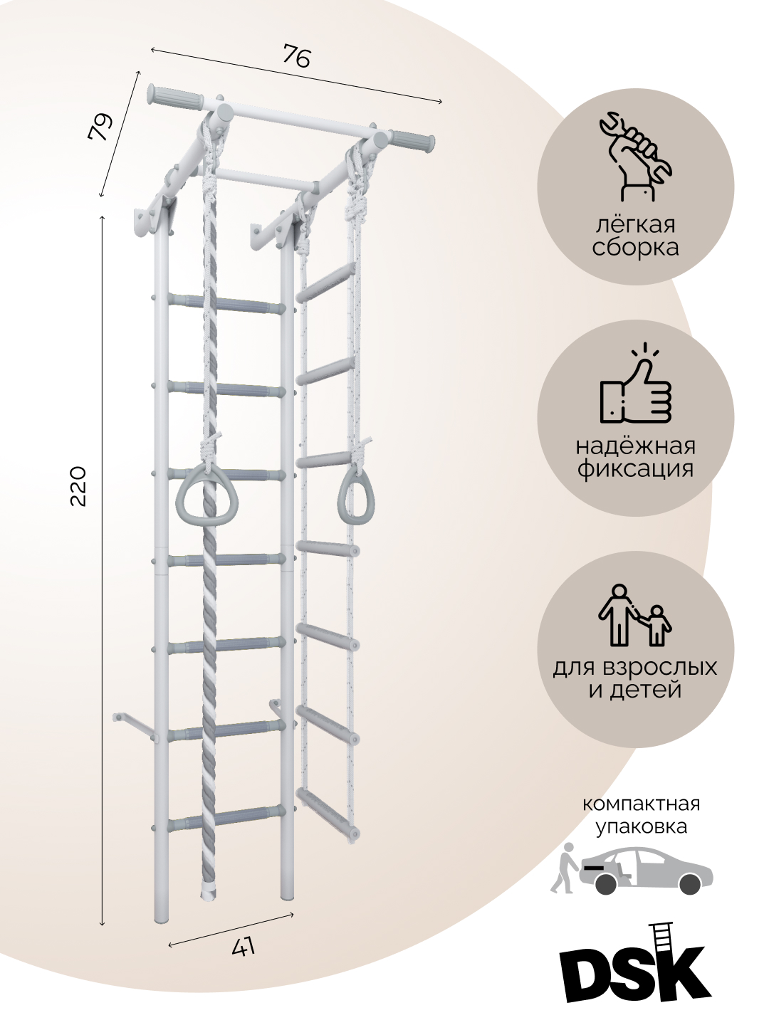 Комплектация: турник неподвижный, канат, кольца гимнастические, лестница веревочная
